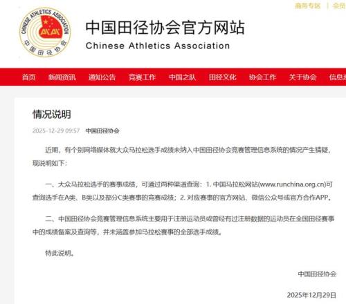 针对此质疑,12月29日,中国田径协会发布情况说明: