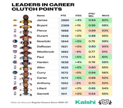 2月1日。有媒体统计并公布了一个数据,那就是关键时刻的总得分和胜率。关键时刻就是最后五分钟内双方比分差距在5分以内,这种时刻比末节和加时赛更能体现一个球员的心理素质和硬解能力。