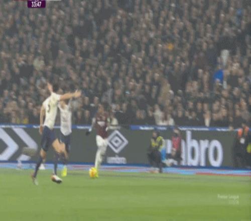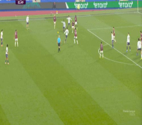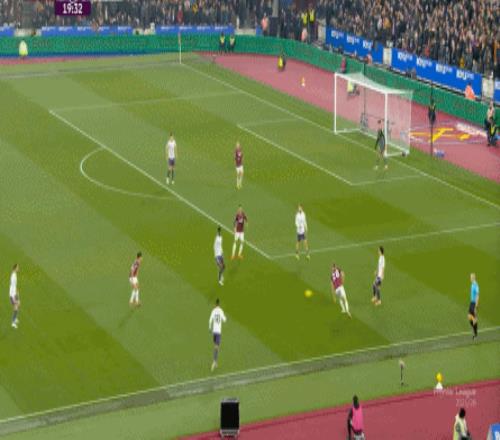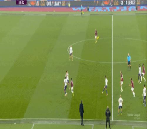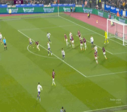 而这种身体层面带来的问题,不仅会出现在有球的时候,也会出现在无球的时候,比如这次高位逼抢,实际上只有布鲁诺一人有效参与,于是西汉姆联后卫可以先抬头观察,再低头起脚,便和鲍文一起制造了前场的定位球: