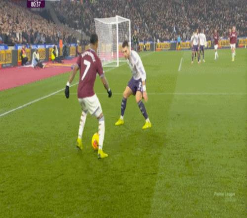 到了这个时候,此前在一周一赛时被掩盖的问题就会浮出水面,比如这次推进,好不容易打出了速度,但到了弱侧,你也不知道是达洛特传大了,还是阿玛德-迪亚洛追不上了,反正一次很好的推进变成了西汉姆联的门球: