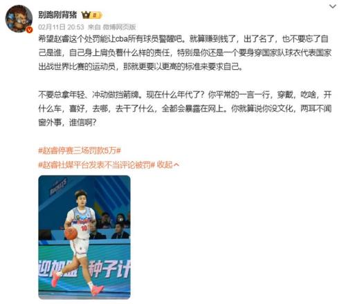 媒体人“别跑刚背猪”也表示:希望赵睿这个处罚能让所有球员警醒,就算赚到钱出了名,不要忘记自己是谁,代表国家队去征战,要有更高的标准要求自己,不要总拿冲动、年轻做挡箭牌,平时的一言一行都会暴露在网上,说的还是非常的犀利,大家都怎么看的?