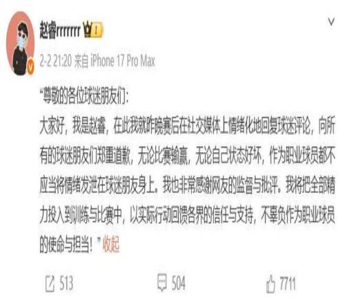 这几句话赵睿是把输球的矛头都对准了新疆球迷,为什么如此针对新疆球迷,自己也曾经在新疆打过球,他没有保持对于老东家的基本尊重,他要是这样讽刺性言论的话,也瞬间在社交平台传开,不少网友认为赵睿带有民族色彩的讽刺,不再适合当中国男篮的队长,而舆论持续发酵,赵睿也被迫在社交平台上做出了发文道歉。但是在赵睿的发文道歉中只字未提新疆,但是评论却字字都是新疆,可见网友并不买账,而赛后又把矛头对准了,他不应该担任中国男篮的队长,也应该把他从国家队除名,这种带有地域歧视色彩的言论,实在不应该从中国男篮队长的嘴里说出来。